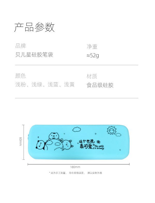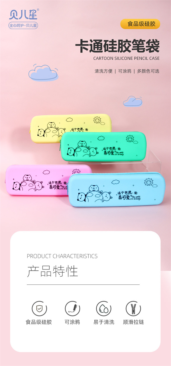 收納硅膠筆袋主要用于文具筆墨橡皮存放,適用于中小學(xué)兒童學(xué)生收納,學(xué)堂用文具盒,可用于存放170MM以下的筆和各種學(xué)習(xí)工具,也可存放收納其他物品以及小型禮品,表面圖案為卡通形狀適用于6-12周歲兒童使用!